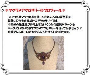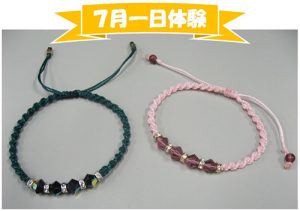 $ 0 0 講座名:マクラメアクセサリー 講師名:吉川恵子 講座内容:マクラメ糸を使って穴の開いていない天然石や好きな石を装飾してアクセサリーに仕上げます 日程:第2・第4土曜日(月2回) 13:00~15:00 月謝:税別4,000円 定員:なし *7月から体験を実施いたします* 「スワロを使ったねじり編みのブレスレット」 日時:7月15日(土)13:00~15:00 講習費:税別1,000円 定員:5名