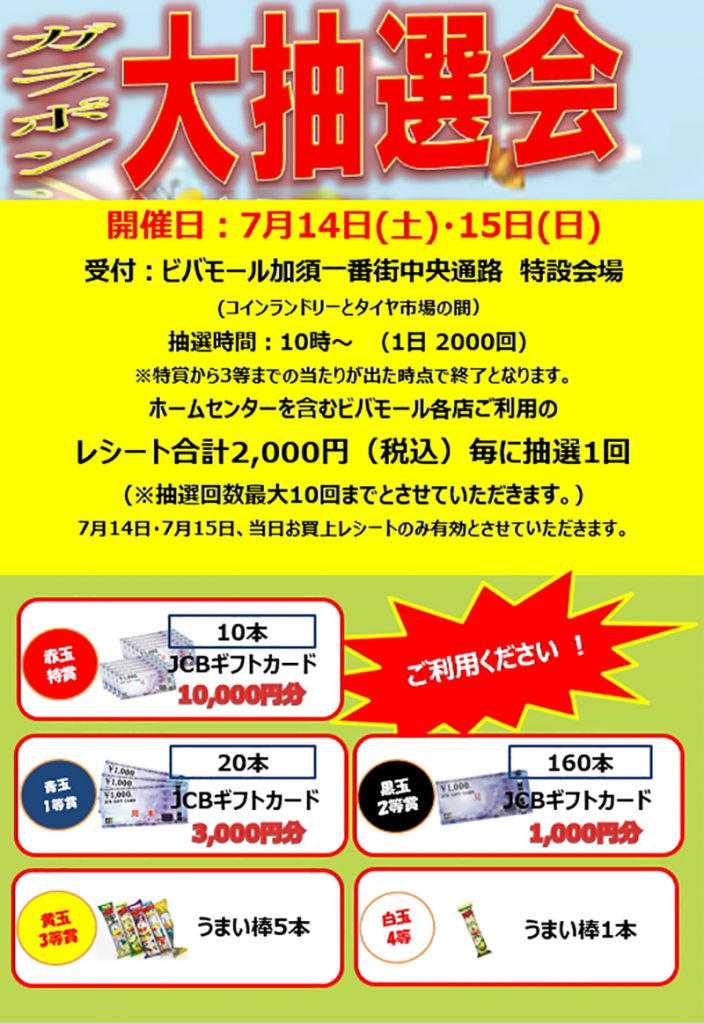 $ 0 0 【抽選時間】10時~(1日 2000回) ※特賞から3等までの当たりが出た時点で終了となります。 【受付場所】ビバモール加須一番街中央通路 特設会場 【参加方法】ビバモール加須全店(スーパービバホーム・フードコート含む)で当日お買上げ合計2,000円(税込・合算可)以上のレシート提示で抽選1回。 ※抽選回数最大10回までとさせていただきます。