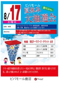 $ 0 0 【抽選時間】11:00~(景品がなくなり次第終了となります) 【受付場所】ドリームファクトリーアロハ前特設会場 【参加方法】抽選会当日、ビバモール鹿沼での(ビバホーム・フードコート含む)お買い上げレシート2,000円(税込・合算可)以上の提示で抽選1回。 ※先着500名様とさせて頂きます。 ※お買い上げ金額にかかわらず、お一人様1回限りとさせていただきます。