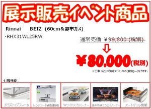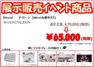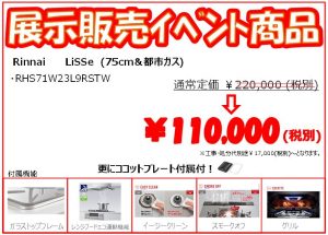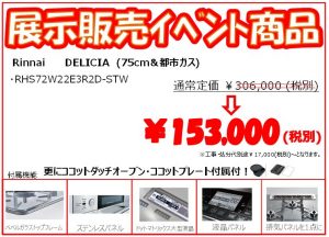 リンナイのビルトインコンロの展示品を販売中です。各限定1台ずつとなっています。無くなり次第終了になります。この機会に是非御来店お待ちしております。
