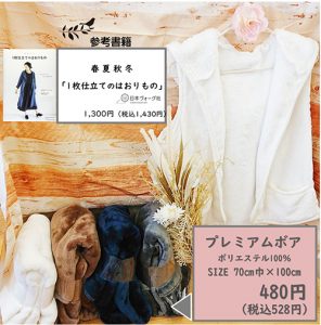 $ 0 0 「着分生地プレミアムボア」で「ふわふわフードベスト」を作ってみませんか。 小物作りで人気の着分の生地ですが、これからの季節にちょうどいいフードベストは1着作ると大活躍しそうです。 画像のフードベストは、「着分生地プレミアムボア」2枚で作ることができます。 プレミアムボア(100×70㎝):1枚当たり480円(税込528円) このほか色々なボア生地がございます。 季節の移り変わりを、手作りを楽しみながら感じましょう。
